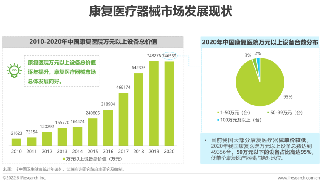 康復(fù)醫(yī)療器械是康復(fù)治療開展的前提與基礎(chǔ)。近年來(lái),在市場(chǎng)需求和國(guó)家政策推動(dòng)下,康復(fù)醫(yī)療器械行業(yè)處于快速成長(zhǎng)期。就我國(guó)而言,康復(fù)醫(yī)院內(nèi)萬(wàn)元以上的康復(fù)設(shè)備總價(jià)值呈現(xiàn)逐年增長(zhǎng)趨勢(shì),但目前國(guó)內(nèi)的康復(fù)器械仍以仿制國(guó)外為主,存在一定程度的產(chǎn)品同質(zhì)化,大部分康復(fù)醫(yī)療器械單價(jià)不高,高端器械占比較小。隨著康復(fù)專科醫(yī)院與康復(fù)服務(wù)機(jī)構(gòu)的發(fā)展,以及政府持續(xù)鼓勵(lì)研發(fā)創(chuàng)新,艾瑞認(rèn)為,未來(lái)高效能、高技術(shù)、高品質(zhì)的高端康復(fù)器械會(huì)逐步滿足人民群眾的健康需求,高端康復(fù)醫(yī)療器械未來(lái)可期。
