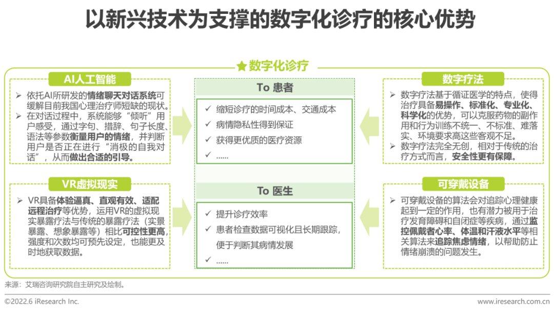 精神心理疾病的治療康復(fù)主要通過(guò)醫(yī)生觀察患者以及聽患者講述自身情況進(jìn)行判斷,并以溝通和口服藥物作為主要治療手段,對(duì)醫(yī)療器械和實(shí)驗(yàn)室檢查的依賴性較低,具有天然的數(shù)字化屬性。加上患者大多對(duì)精神心理疾病抱有“病恥感”,線上問(wèn)診的形式可以有效弱化患者的就診抵觸心理。在供給側(cè)不變的情況下通過(guò)技術(shù)進(jìn)行資源的重新整合和配置,讓遠(yuǎn)在三四線城市患有精神心理問(wèn)題的患者能夠通過(guò)遠(yuǎn)程診療獲得在一線城市專家的問(wèn)診。對(duì)于醫(yī)生而言,數(shù)字化診療能夠幫助醫(yī)生對(duì)患者的病情有長(zhǎng)期式的跟蹤了解,從而提升診療效率。