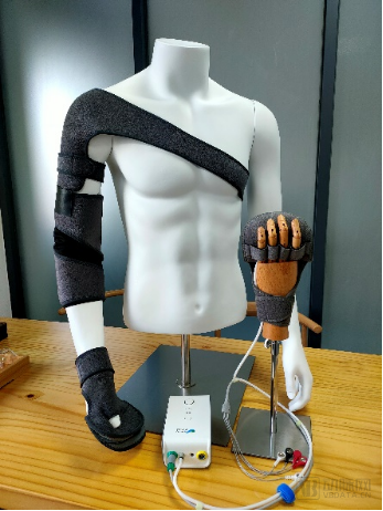 該設(shè)備主要特點在以下幾個方面:創(chuàng)新性地采用了氣動軟體外骨骼與神經(jīng)電刺激相結(jié)合的多模態(tài)設(shè)計,有效精準(zhǔn)康復(fù)指定癱瘓肌肉功能,實現(xiàn)了多通道在指定肌肉上利用相同電極進(jìn)行表面肌電(sEMG)實時采集與電刺激控制,實現(xiàn)了手指、腕、肘多角度獨立或系統(tǒng)的多關(guān)節(jié)運動,采用表面肌電觸發(fā)的主動驅(qū)動訓(xùn)練模式。