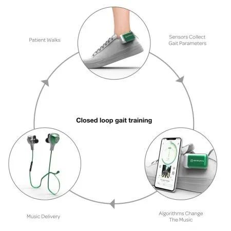 該數(shù)字療法的使用者需要將傳感器夾在鞋子上,戴上耳機(jī)即可開(kāi)始與專業(yè)音樂(lè)治療師的視頻會(huì)話。傳感器收集患者的基線步態(tài)數(shù)據(jù),算法持續(xù)接收來(lái)自傳感器的實(shí)時(shí)數(shù)據(jù),根據(jù)用戶數(shù)據(jù)實(shí)施臨床干預(yù)措施?;颊呗?tīng)著音樂(lè)隨著節(jié)拍行走,算法不斷評(píng)估患者行走能力并提供聽(tīng)覺(jué)刺激。除了數(shù)字療法外,MedRhythms還提供遠(yuǎn)程的神經(jīng)音樂(lè)療法,主要面向腦損傷、阿爾茨海默癥、帕金森癥、發(fā)育障礙和多發(fā)性硬化癥,通過(guò)音樂(lè)療法幫助患者恢復(fù)語(yǔ)言、行動(dòng)、認(rèn)知等方面的能力。
