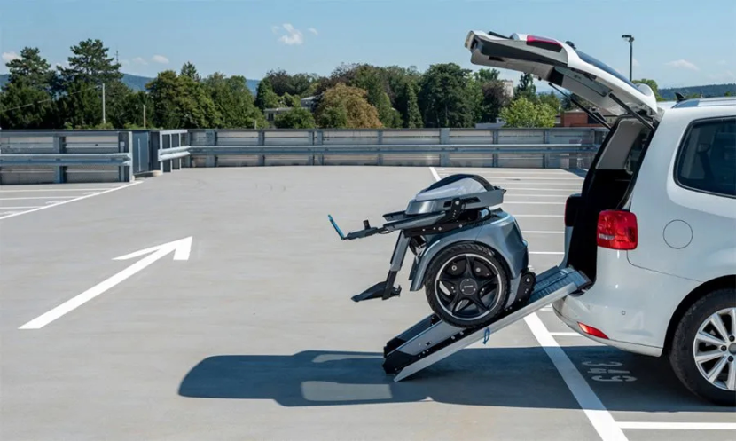如果有遠途出行的需求,這款電動輪椅也非常方便攜帶。因為輪椅設(shè)有快速折疊機制,只需要一握就可以將它的靠背完全折疊起來,讓輪椅的長寬高分別變?yōu)?130/695/790mm的更緊湊尺寸。然后只需要一個滑軌,用戶就可以把這個重達162公斤的家伙塞進汽車后備箱或是其他存儲空間內(nèi)。
