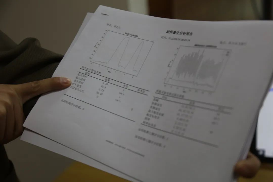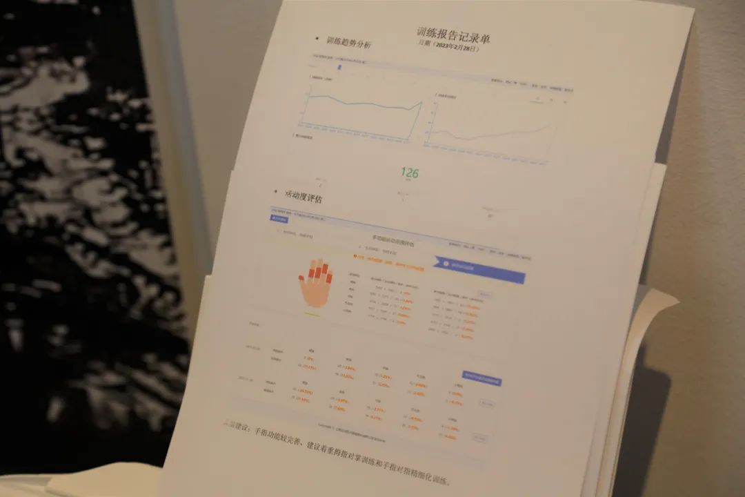 “握緊、打開……好的,數(shù)據(jù)已經(jīng)記錄下來了。”工作人員帶領(lǐng)彭老伯正在進(jìn)行手部活動(dòng)度評(píng)估。接著,一張含有訓(xùn)練趨勢分析和活動(dòng)度評(píng)估的訓(xùn)練報(bào)告記錄單就“出爐”了。報(bào)告顯示彭老伯的手指功能較完善,建議著重拇指對(duì)掌訓(xùn)練和手指對(duì)指精細(xì)化訓(xùn)練。