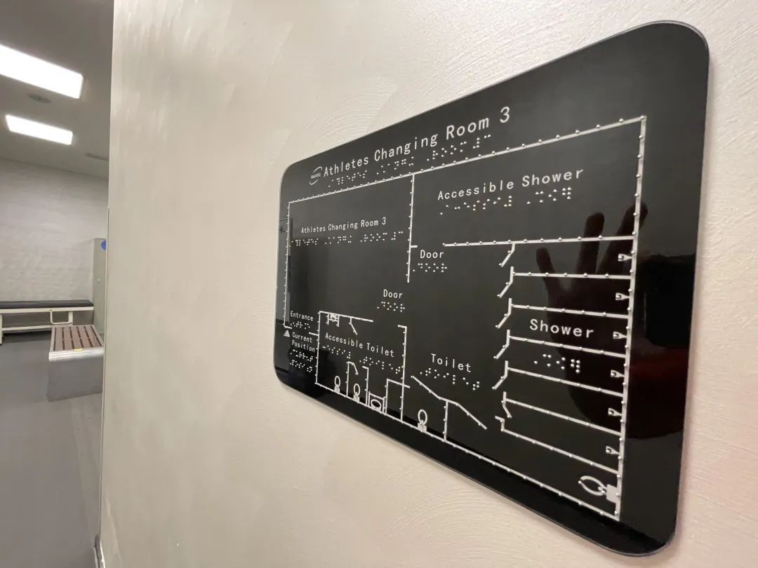 在承辦盲人足球比賽的拱墅運河體育公園體育場,除了對運動員流線鋪設(shè)盲道外,針對盲人運動員需求,場館運行團隊在4個運動員更衣室門口加裝了盲文指示板,更衣柜上貼了盲文數(shù)字貼。