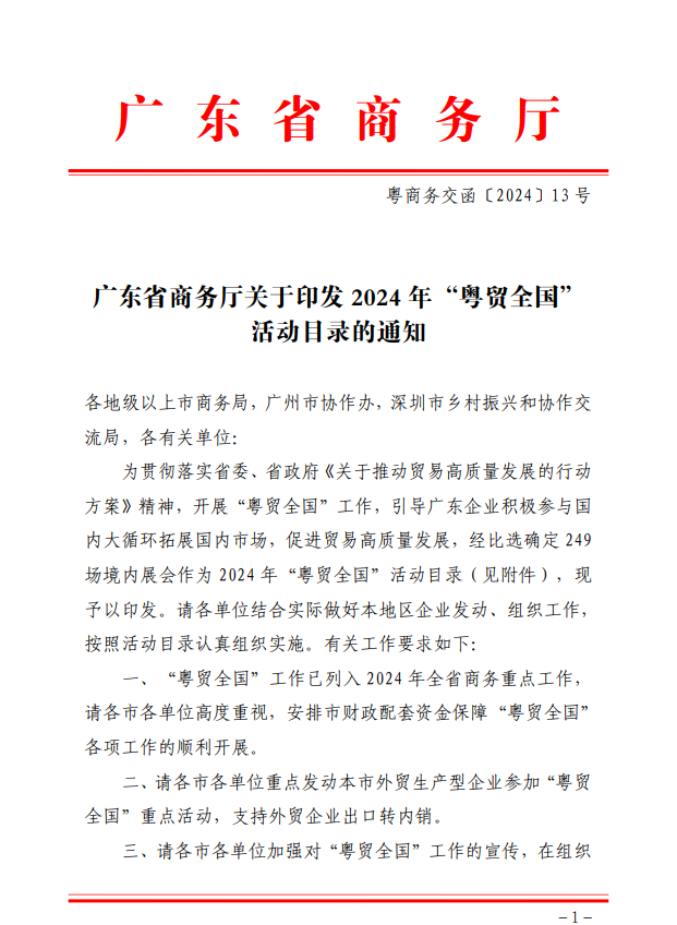 “粵貿(mào)全國”活動(dòng)是貫徹落實(shí)黨中央、國務(wù)院關(guān)于推進(jìn)貿(mào)易高質(zhì)量發(fā)展指導(dǎo)意見的一個(gè)具體措施,為進(jìn)一步貫徹落實(shí)廣東省委、省政府《關(guān)于推動(dòng)貿(mào)易高質(zhì)量發(fā)展的行動(dòng)方案》。入圍展會(huì)將列入2024年全省商務(wù)重點(diǎn)工作,并優(yōu)先獲得政府相關(guān)政策扶持。
