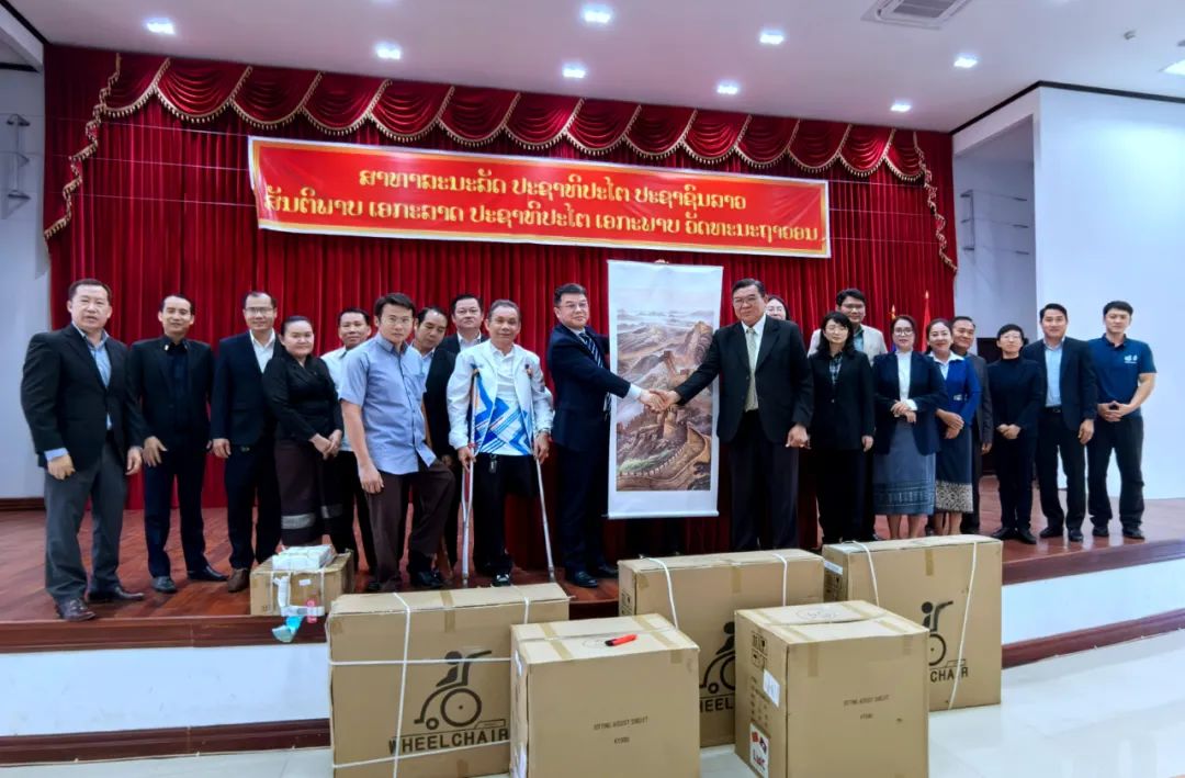 ▲亞洲合作資金-愛心助殘惠瀾湄·輔助器具服務(wù)能力提升項(xiàng)目在老撾的捐贈(zèng)儀式。此次項(xiàng)目所捐助的產(chǎn)品都是根據(jù)當(dāng)?shù)匦枨笳{(diào)研結(jié)果而采購(gòu)的中國(guó)生產(chǎn)的高品質(zhì)輔助器具。