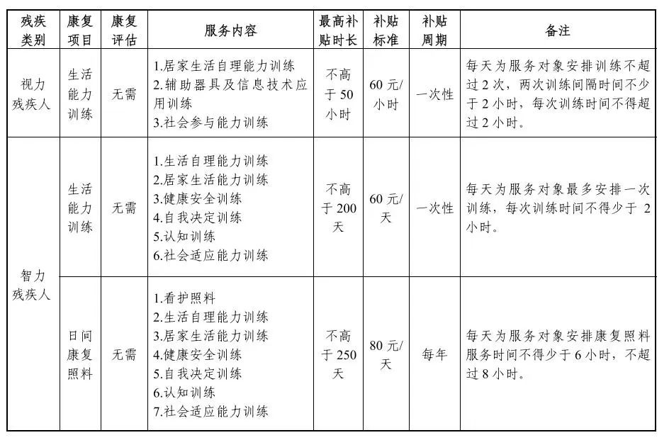 3.醫(yī)療康復項目資助,包括:0-14歲聽力語言殘疾兒童康復訓練 、0-14歲低視力殘疾兒童康復訓練、0-17歲智力殘疾兒童康復訓練、0-17歲孤獨癥譜系障礙兒童康復訓練、肢體殘疾人康復訓練、居家康復服務,資助條件和標準按照本市醫(yī)療康復項目納入殘疾人康復資助保障范圍政策執(zhí)行