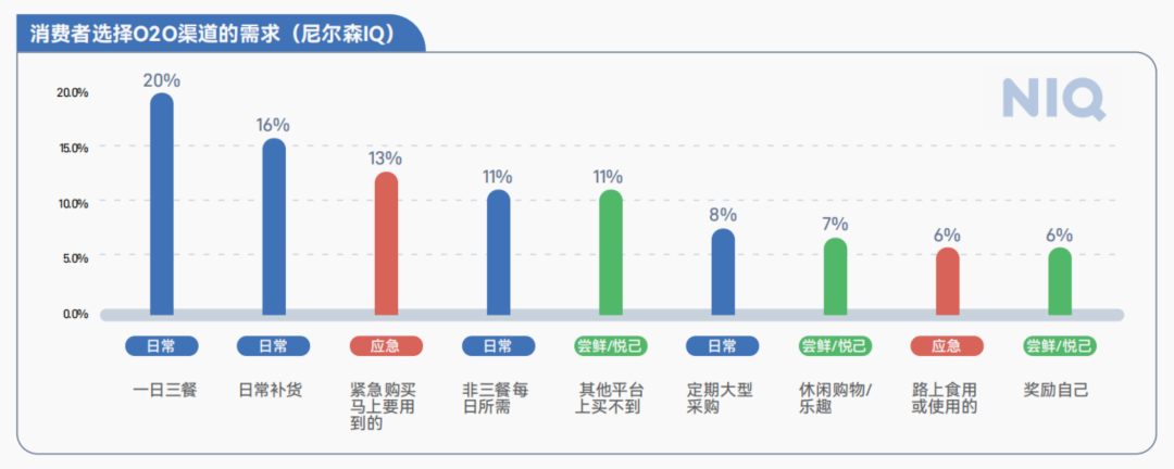 當(dāng)前即時零售消費(fèi)需求從應(yīng)急走向日常,在到店消費(fèi)、B2C和O2O即時到家三大消費(fèi)場景中,將逐步從到店、B2C轉(zhuǎn)向O2O即時到家。全品類、全時段、全場景即時零售消費(fèi)需求持續(xù)增長。消費(fèi)者選擇O2O模式的需求更趨于日?;?,“一日三餐”和“日常補(bǔ)貨”排名在前兩位,已經(jīng)不單純是應(yīng)急需求。O2O將為實(shí)體店插上騰飛的翅膀,“萬物到家”將是未來必然趨勢。