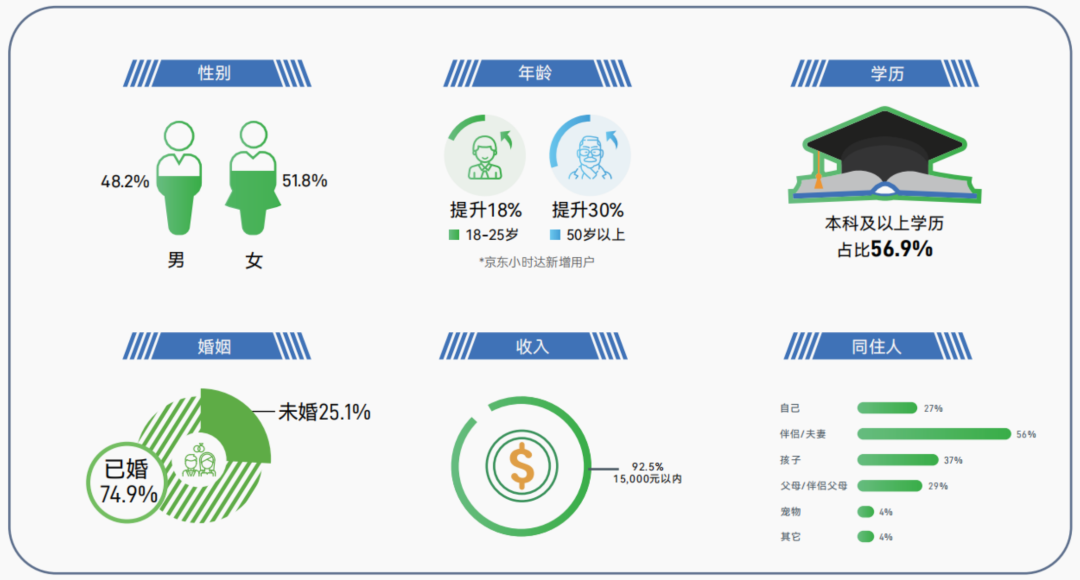 即時零售的消費(fèi)群體覆蓋面也不斷擴(kuò)大。京東到家2022年調(diào)研數(shù)據(jù)顯示,即時零售消費(fèi)群體主要以25-45歲之間人群為主。除主力人群外,2023年,新增用戶中,18-25歲的消費(fèi)者占比較2022年提升了18%,50歲以上即時零售消費(fèi)者群體則提升了約30%。