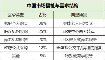 雖然普及度低,但實(shí)際上殘疾人和老年人對福祉車的需求相當(dāng)強(qiáng)烈。目前家庭個人購買福祉車的需求占比38%,其次是醫(yī)療機(jī)構(gòu)采購、養(yǎng)老機(jī)構(gòu)租賃等。