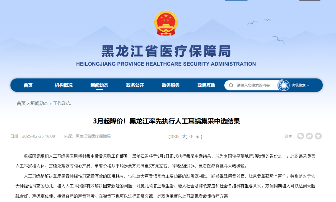 根據(jù)國家組織人工耳蝸類醫(yī)用耗材集中帶量采購工作部署,黑龍江省于3月1日正式執(zhí)行集采中選結(jié)果,成為全國較早落地該項政策的省份之一。此次集采覆蓋人工耳蝸植入體、言語處理器等核心產(chǎn)品,單套價格從平均20余萬元降至5萬元左右,降幅達到75%,患者醫(yī)療負擔(dān)將大幅減輕。
