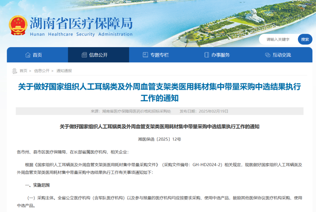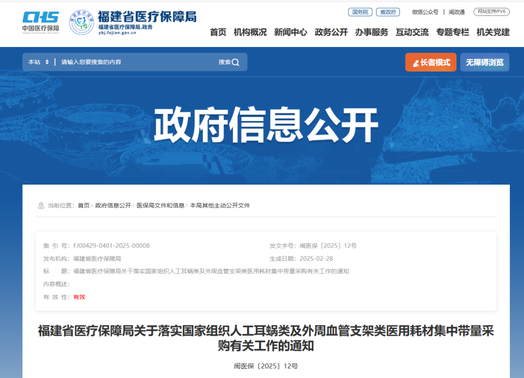 2月28日,福建醫(yī)保局發(fā)布《關(guān)于落實國家組織人工耳蝸類及外周血管支架類醫(yī)用耗材集中帶量采購有關(guān)工作的通知》,其中指出,人工耳蝸類中選結(jié)果于2025年3月7日在福建省醫(yī)療保障信息平臺藥品和醫(yī)用耗材招標(biāo)和采購交易子系統(tǒng)掛網(wǎng),3月11日起正式執(zhí)行;外周血管支架類中選結(jié)果于5月12日在招采子系統(tǒng)掛網(wǎng),5月14日起正式執(zhí)行。