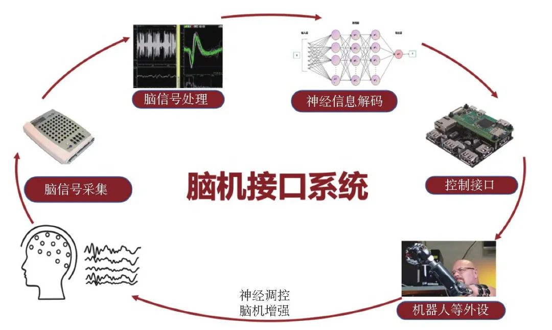 而腦機(jī)接口系統(tǒng)作為一種多學(xué)科交叉融合的復(fù)雜體系,其集成了神經(jīng)科學(xué)、信號處理、計算機(jī)科學(xué)、人工智能等多學(xué)科知識,無論是侵入式還是非侵入式的腦機(jī)接口技術(shù),其系統(tǒng)都主要由用戶(大腦)、腦信號采集、腦信號處理與解碼、控制接口、機(jī)器人等外設(shè)和神經(jīng)反饋構(gòu)成。其中,最核心的組件是腦信號采集、腦信號處理與解碼以及控制接口三部分。