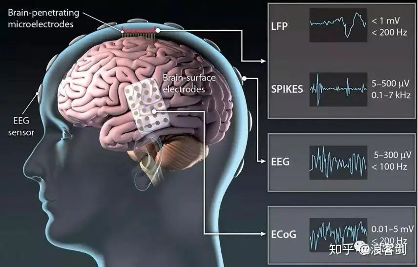 根據(jù)信號采集方式和技術(shù)的不同,腦機(jī)接口可分為非侵入式(腦外)、侵入式和半侵入式。非侵入式是指無需通過侵入大腦,只需要通過附著在頭皮上的穿戴設(shè)備來對大腦信息進(jìn)行解讀,常見技術(shù)為腦電圖(EEG);半侵入式則是將腦機(jī)接口植入到顱腔內(nèi),但是植入位置在大腦皮層之外,主要基于皮層腦電圖(ECoG)進(jìn)行信息分析;而侵入式則是通過手術(shù)等方式直接將電極植入到大腦皮層,微電極陣列(MEA)和神經(jīng)元放電檢測(SUA)則最為常見,以此獲得高質(zhì)量的大腦神經(jīng)信號。