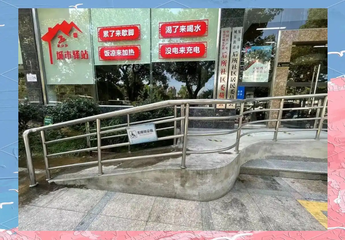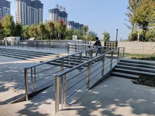 無障礙通道,通常在有臺階的地方會修建斜坡,并配備扶手欄桿,旨在為輪椅使用者及腿力不佳者提供便捷的通行方式。此外,無障礙設施還包括專為這類人群設計的停車位。