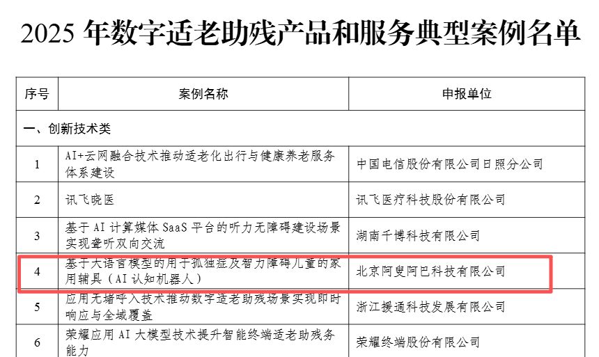 1月21日,國(guó)家工業(yè)和信息化部正式公布2025年數(shù)字適老助殘產(chǎn)品和服務(wù)典型案例名單,北京阿叟阿巴科技有限公司(ALSOLIFE)自主研發(fā)的“基于大語(yǔ)言模型的用于孤獨(dú)癥及智力障礙兒童的家用輔具(AI認(rèn)知機(jī)器人)”成功入選!
