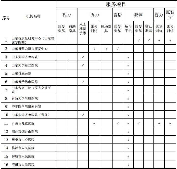 為貫徹落實《山東省人民政府關于建立殘疾兒童康復救助制度的通知》精神,日前,山東省、市、縣三級殘聯(lián)會同有關部門按照《關于印發(fā)山東省承擔殘疾人康復服務機構準入標準(試行)的通知》要求,結(jié)合實際需求,確定了承擔殘疾兒童康復救助任務的定點機構(第一批),并向社會公布公開,供廣大有需求殘疾兒童監(jiān)護人選擇。