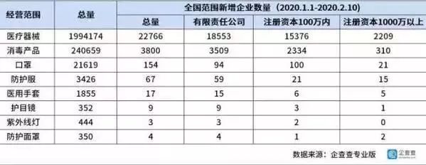 根據(jù)企查查專業(yè)版數(shù)據(jù)顯示,自2020年1月1日至2月10日,經(jīng)營范圍涉及醫(yī)療器械、消毒產(chǎn)品等防護制品的企業(yè)增勢喜人,全國范圍內(nèi)醫(yī)療器械新增企業(yè)數(shù)超2萬家,消毒產(chǎn)品次之。