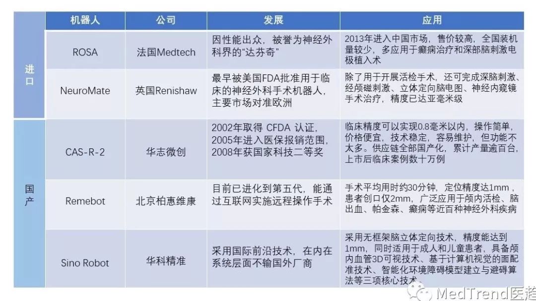 英國(guó)的NeuroMate、法國(guó)的 ROSA和以色列的Renaissance 是率先拿到 FDA 認(rèn)證的神經(jīng)外科醫(yī)療機(jī)器人,Neuromate產(chǎn)品主要市場(chǎng)對(duì)準(zhǔn)歐洲,而ROSA已于2013年進(jìn)入中國(guó)市場(chǎng),但當(dāng)前售價(jià)較高,裝機(jī)量較少,市場(chǎng)基本處于空白狀態(tài)。