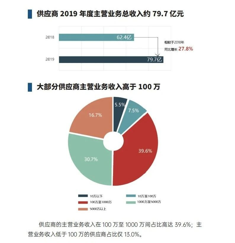 供應(yīng)商2019年度主營業(yè)收入為79.7億元,較2018年同比增長27.8%;總納稅額共計3.1億元,較2018年同比增長24.2%。服務(wù)機構(gòu)營業(yè)收入共計1.9億元,較2018年同比增長23.0%;總納稅額共計0.12億元,較2018年同比增長5.1%。