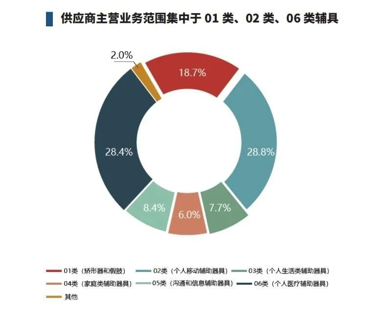供應(yīng)商主營業(yè)務(wù)絕大部分集中在01-06類輔具,其中02類(個人移動輔助器具)和06類(個人醫(yī)療輔助器具)占比相對較高。結(jié)合供應(yīng)商經(jīng)營情況可知,供應(yīng)商在02類輔具和06類輔具上的產(chǎn)銷額和產(chǎn)銷量也較高。